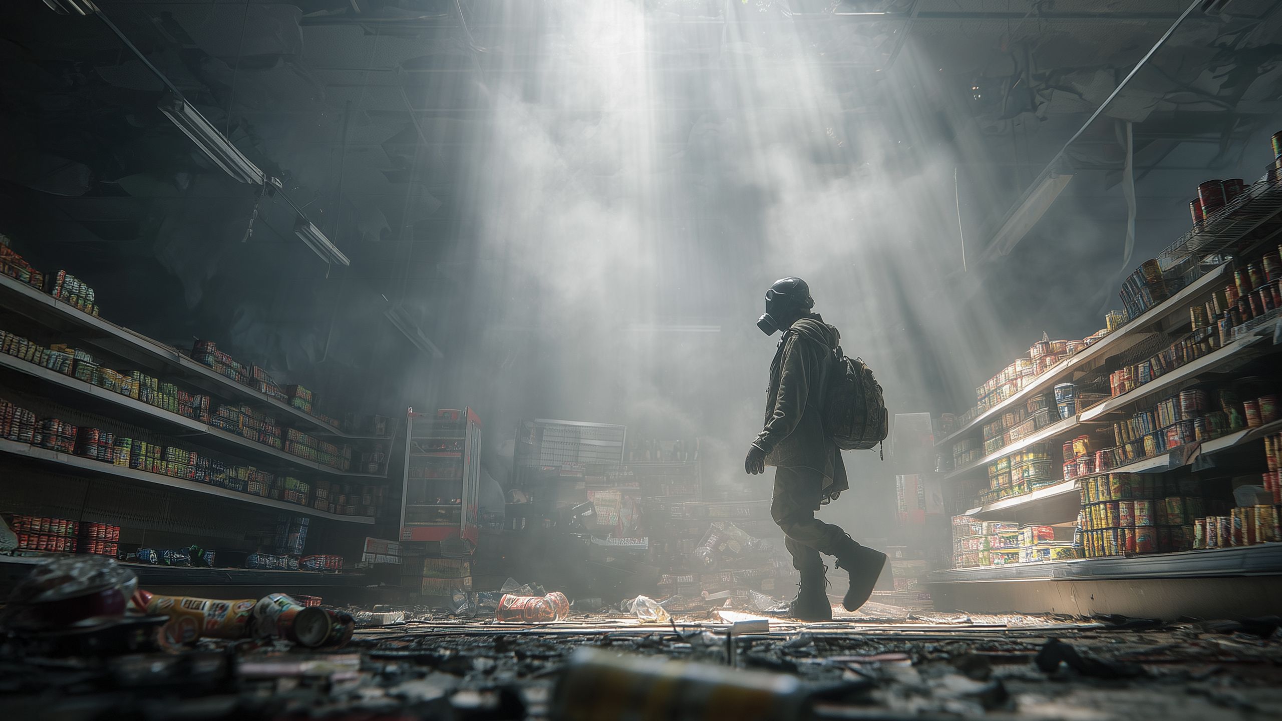To a state in the world where the very air we breathe is toxic. I pull my mask back up over my mouth and push on through the abandoned aisles of the local convenience store. Any more than a few moments in this air without a mask, and my lungs will collapse.